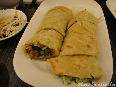 感覺就是燒餅皮裹著雞肉絲與小黃瓜絲,吃起來蠻清爽,不會覺得油膩。