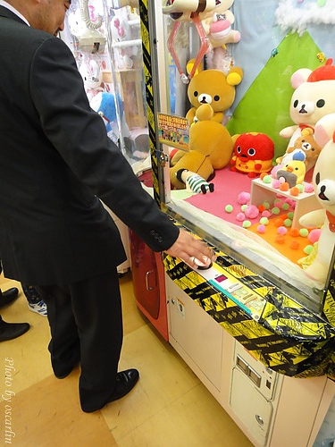 逛到一間夾娃娃店,一個小男生很期待他爸爸夾小熊給他,